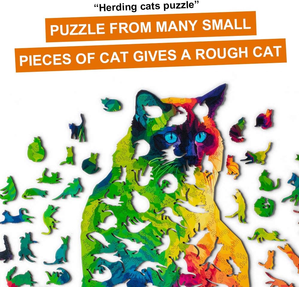 Herding cats was previously impossible but now its a wooden jigsaw puzzle you can complete at home. A treat for all cat lovers Herding Cats is a technicolour cat puzzle with over forty whimsical felines lurking within a 224-piece wooden puzzle. 8 years and up.